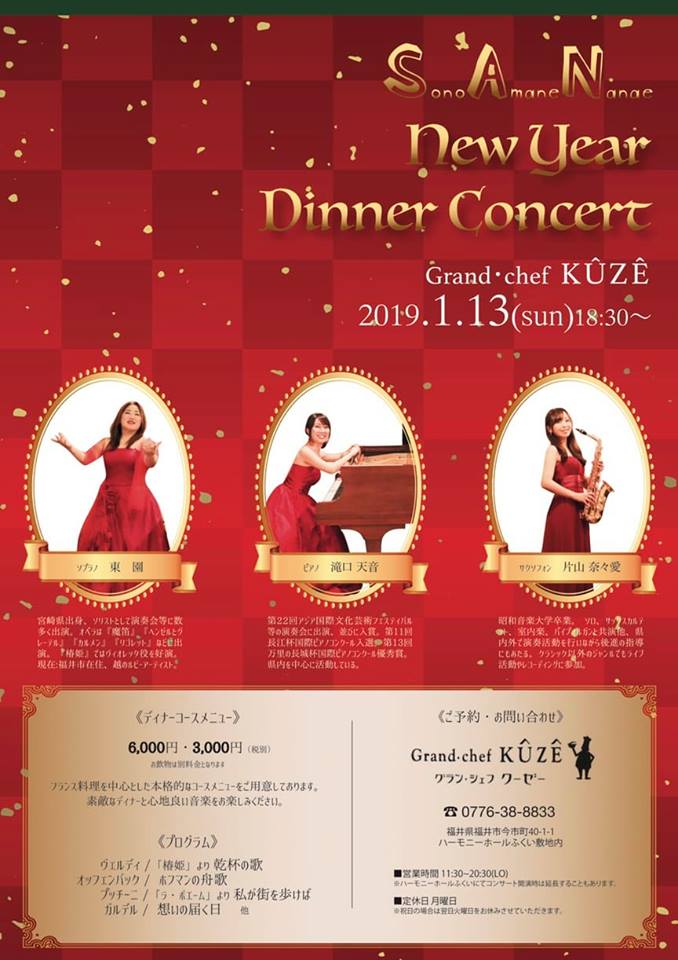 ハーモニーホール敷地内にあるフレンチレストランにてニューイヤーディナーコンサートをサクソフォン 片山奈々愛さんピアノ 滝口天音さんソプラノ 東園のトリオ SAN(サン)で演奏致しますお時間ございましたら是非 御来場下さいませ