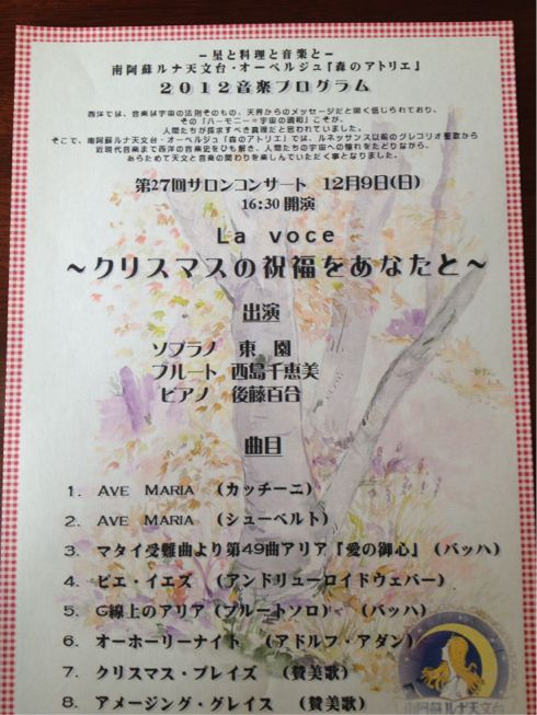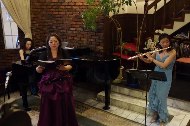 本日はピアニストの後藤百合さん、フルーティストの西島ちえみさん、そして、私、ソプラノの東園でオーベルジュ森のアトリエ、ルナ天文台で演奏させていただきました。