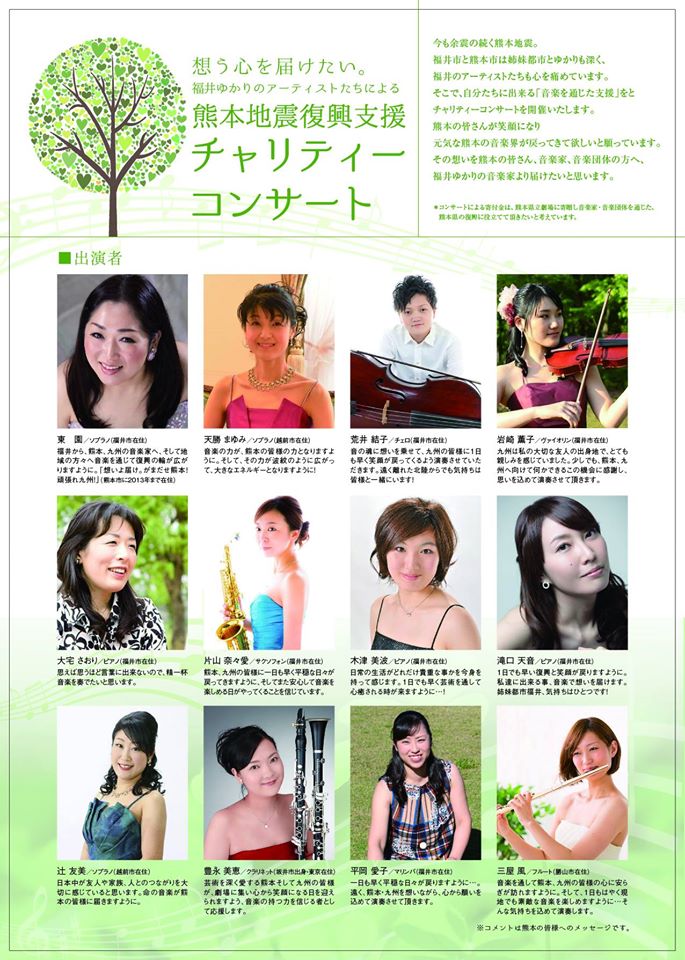 福井からも数名先日の熊本地震復興支援チャリティーコンサートに出演してくれたアーティストがこの熊本で計画されたコンサートに出演してくれるというお話いただいています。